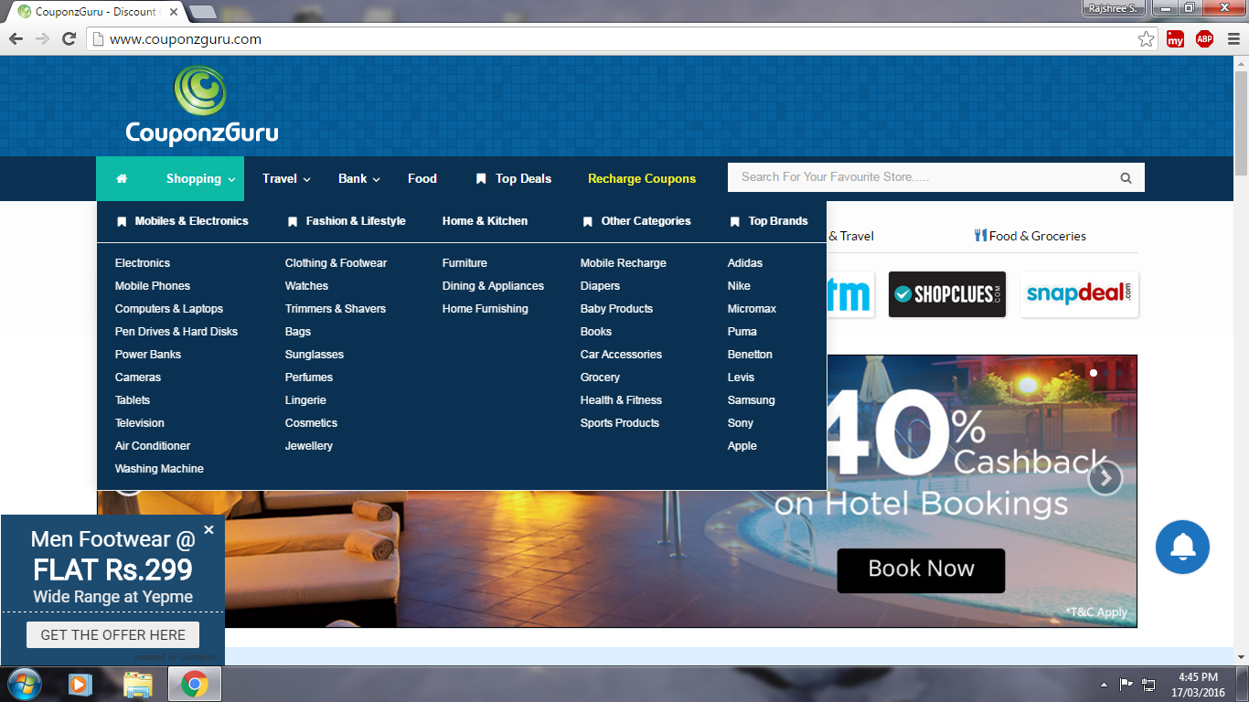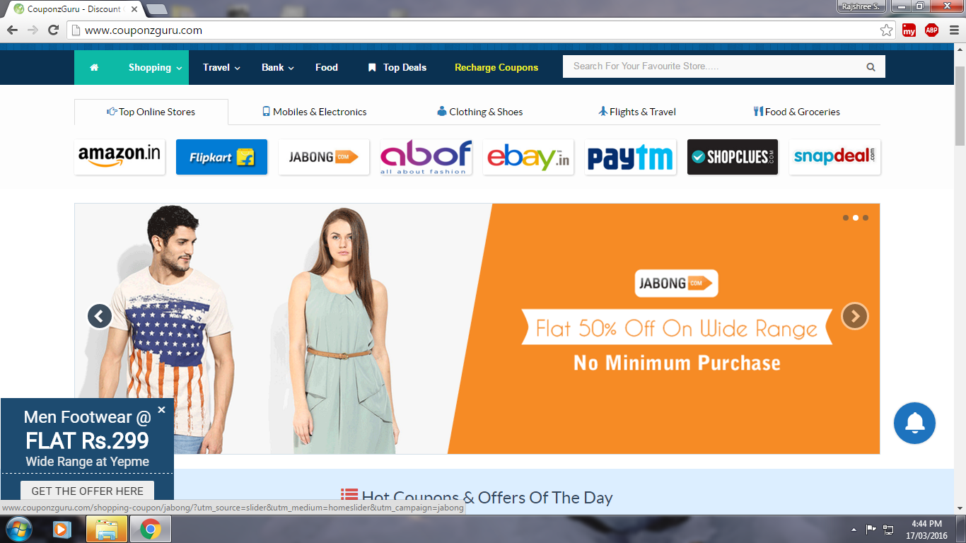 To start with, the layout of the website is very clean, crisp and user friendly. The homepage features 4 important tabs which include Shopping, Food, Travel & Bank. Also the page features a Top Deals of the month section that covers some of the most widely searched and used coupon codes for the month.