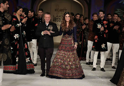 Ace designer Rohit Bal's collection "Koroshini" was probably one of the most stunning collections showcased at Lakme Fashion Week Summer/Resort 2016. The word Koroshini stands for illuminate because of which the collection depicted a lovely combination of rich detailing and elegant fabrics. The entire range was made from the organic fabric Mulmul along with intricate embroidery detailing that was used by ancient crafted artisans. The Royal Begum Kareena Kapoor Khan was the showstopper and muse for the Korshini collection who was seen wearing a royal blue lehenga choli with golden chaand motif detailing.
