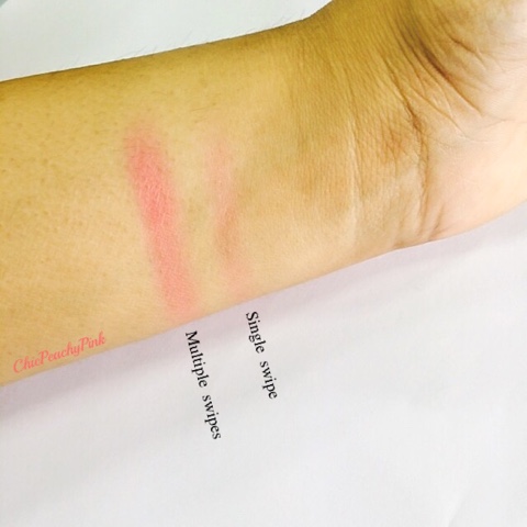 The blush is extremely pigmented and I do not have to work to build the color. By extremely pigmented I mean that you cannot apply it like your regular blushes, only light dabbing motion is suggested by me to get a natural look. One stroke of the brush, a little tapping, a little dabbing and blending and am good to go. The lasting power of the blush is fantastic, it stays on for easily more than 7-8 hours which is quite impressive.