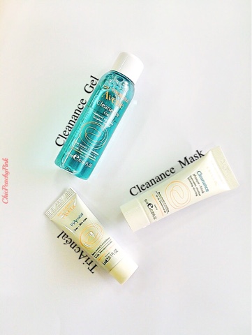 This 3 Step routine consists of a 25ml Cleanance Gel Soapfree Cleanser, a 10ml Cleanance Mask and 5ml TriAcnéal Skincare. Unlike most of the soapfree cleansers I have come across the cleanance soapfree cleanser lathers really well. It is a mild cleanser which cleans and refreshes me but doesn't strip my face making it a delightful morning cleanser.