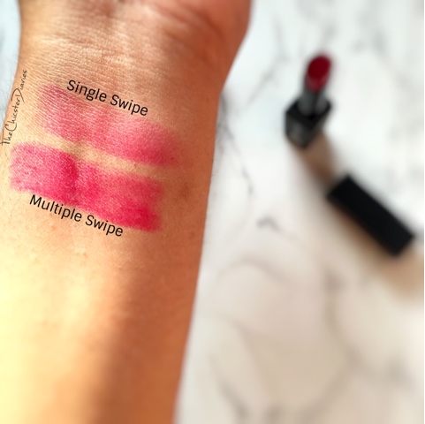 - The product has a creamy and moisturising formula because of which it smoothly glides on the lips. On application the product takes a few minutes to settle into a semi-matte finish and during this time you need to be a bit cautious as the product can get transferred easily.