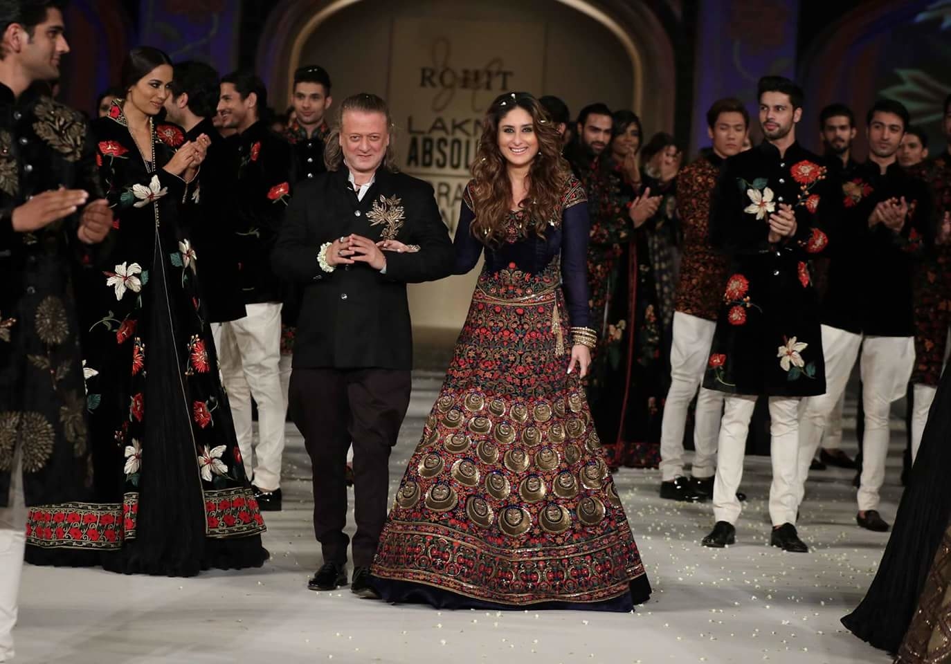 Ace designer Rohit Bal's collection "Koroshini" was probably one of the most stunning collections showcased at Lakme Fashion Week Summer/Resort 2016. The word Koroshini stands for illuminate because of which the collection depicted a lovely combination of rich detailing and elegant fabrics. The entire range was made from the organic fabric Mulmul along with intricate embroidery detailing that was used by ancient crafted artisans. The Royal Begum Kareena Kapoor Khan was the showstopper and muse for the Korshini collection who was seen wearing a royal blue lehenga choli with golden chaand motif detailing.
