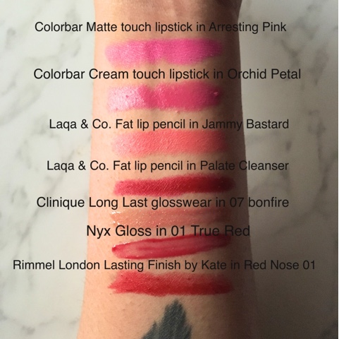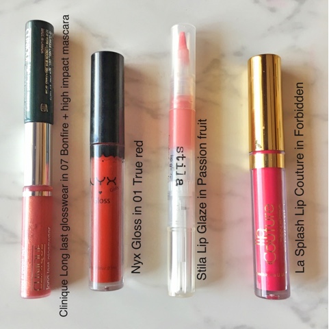 | Nyx Round Lip Gloss in 01 true red, Stila Lip glaze in Passion fruit, LA SPLASH Lip Couture Liquid Lipstick in Forbidden |