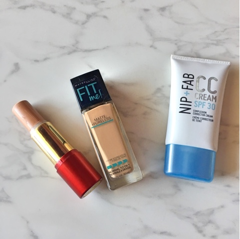 | (Top to bottom) Lotus Naturalblend Swift Makeup Stick-Natural Beige, Maybelline New York Fit Me foundation, NIP & FAB CC cream in Dark |