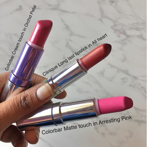 | Colorbar cream touch lipstick in Orchid Petal, Clinique long last lipstick in All heart, Colorbar Matte touch lipstick in Arresting Pink |