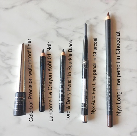 | Colorbar Precision waterproof liner, Lancome Le Crayon Mini Kohl 01 Noir, Lord & Berry Mini Pencil in Sparkle black, Nyx auto eye pencil in Charcoal, Nyx long eye pencil in Chocolat |