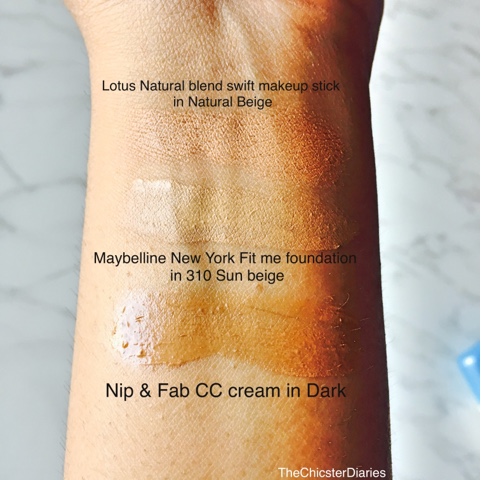 | (Right to Left) Lotus Naturalblend Swift Makeup Stick-Natural Beige, Maybelline New York Fit Me foundation, NIP & FAB CC cream in Dark |