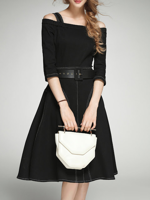 | How to pick your perfect evening wear dress - Cold Shoulder 3/4 Sleeve A-line Zipper Denim Midi Dress with Belt |